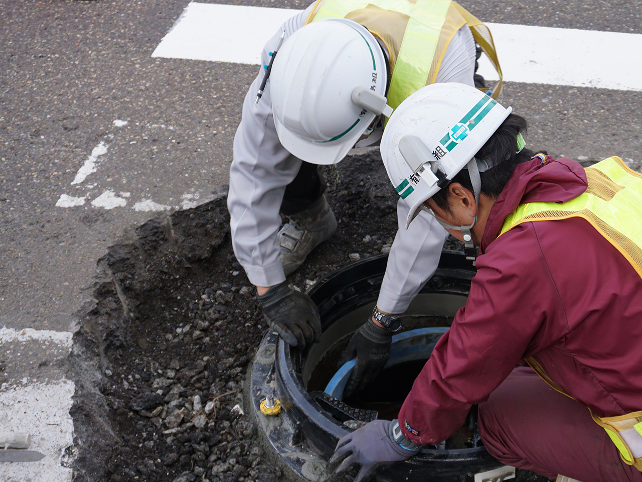 老朽化や損傷したマンホール蓋を、安全性の確保や通行の円滑化などを図るために新しい蓋に交換する工事を行っています。